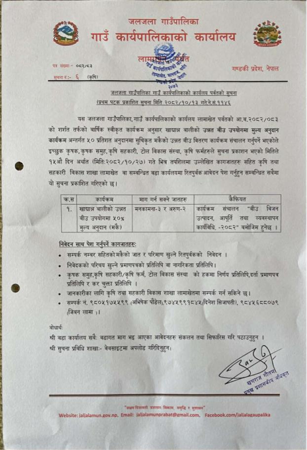 खाद्यान्न बालीको उन्नत बीउको उपयोगमा ५० % मूल्य अनुदान (मकै) सम्बन्धी सूचना !!