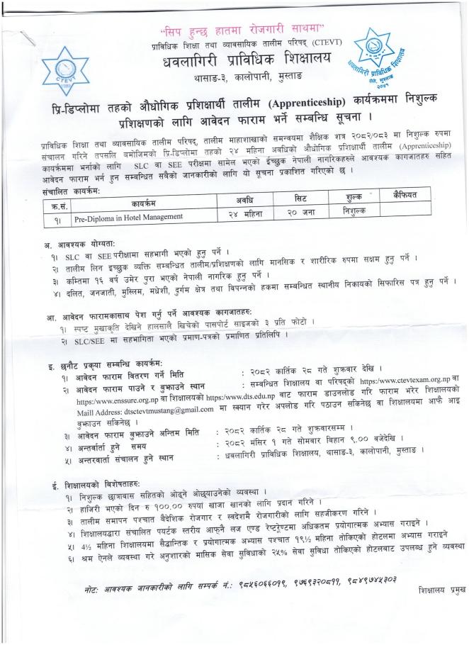 » धवलागिरी प्राविधिक शिक्षालय, थासाङको प्रि-डिप्लोमा तहको औधोगिक प्रशिक्षार्थि तालीम कार्यक्रम निःशुल्क प्रशिक्षणको लागि आवेदन फारम भर्ने सम्बन्धि सूचना ।