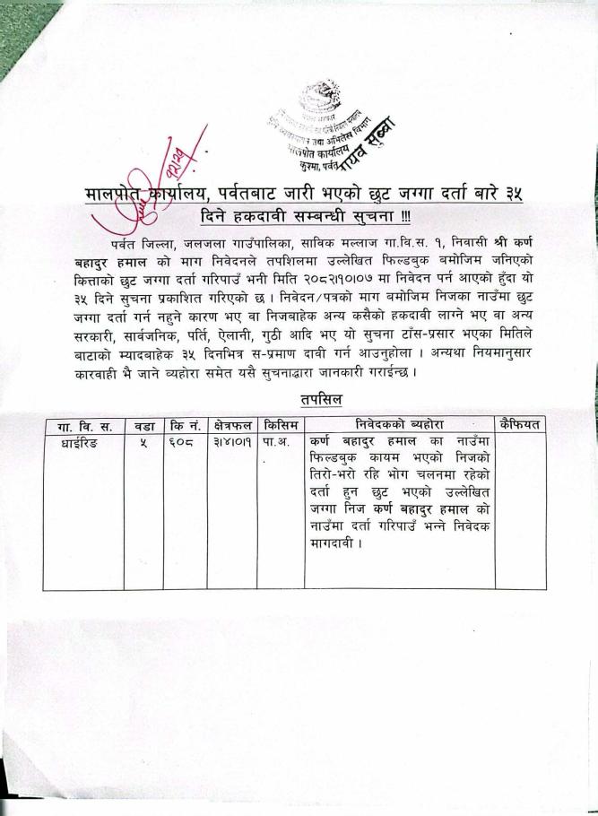 मालपोत कार्यालय, पर्वतबाट जारी भएको छुट जग्गा दर्ता बारे ३५ दिने हकदावी सम्बन्धी सूचना !!