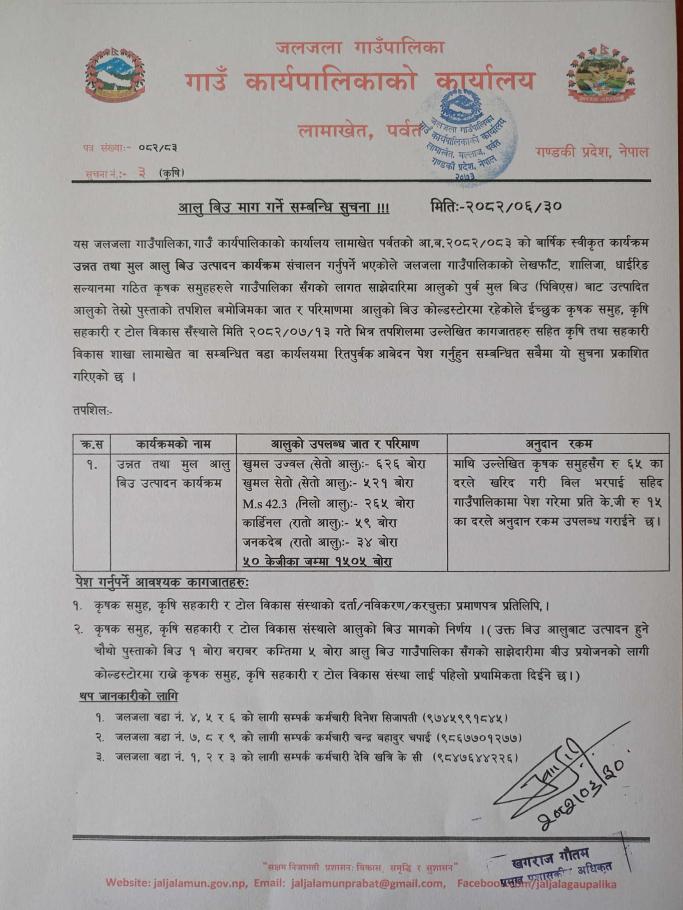 आलुको बिउ माग गर्ने सम्बन्धी सूचना !!